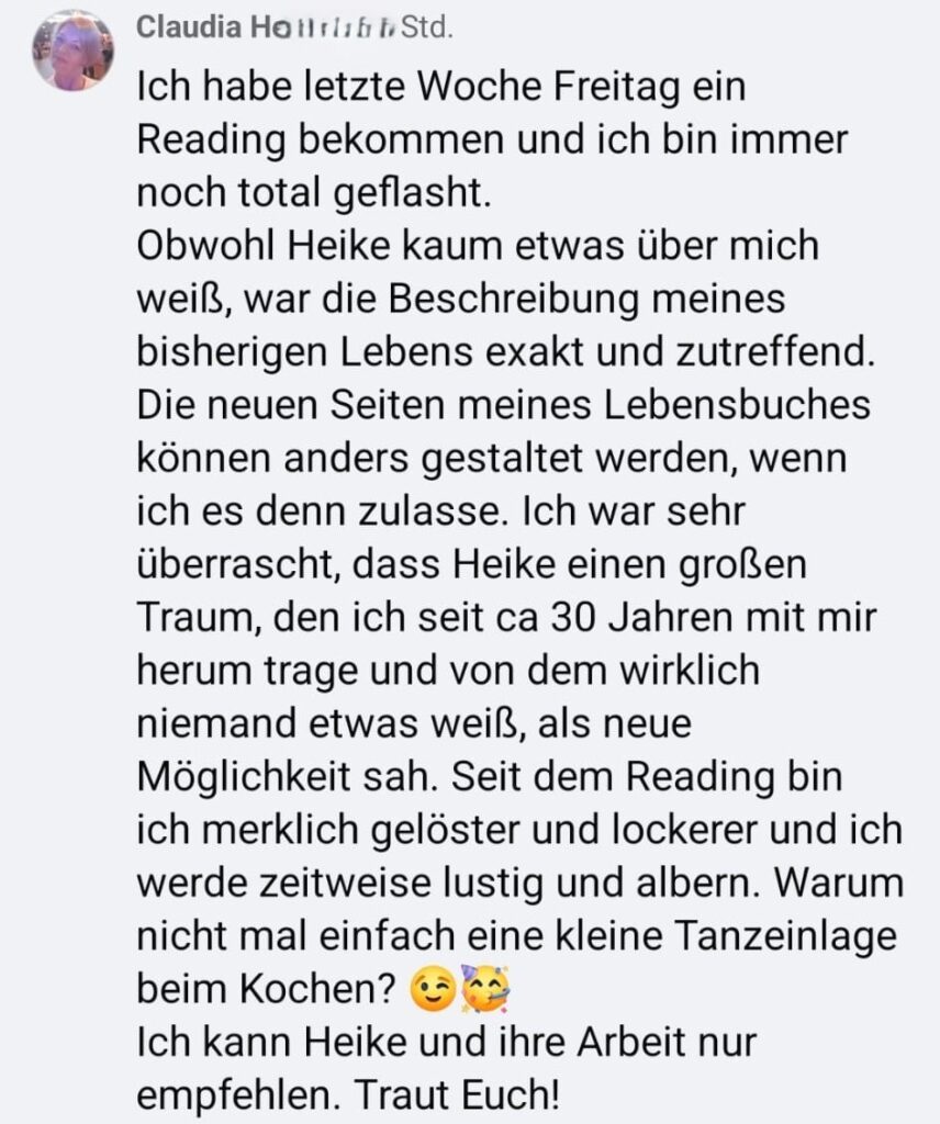 Du beauftragst mich für das Reading. Dafür brauche ich deinen Namen und dein Geburtsdatum. Mehr nicht. Innerhalb von 3 Tagen erstelle ich dein Reading und vereinbare mit dir einen Termin zur Besprechung (ca. 45min), entweder telefonisch oder per Videocall. Du bekommst klare Impulse, keine Bewertungen und keine Vorhersagen.